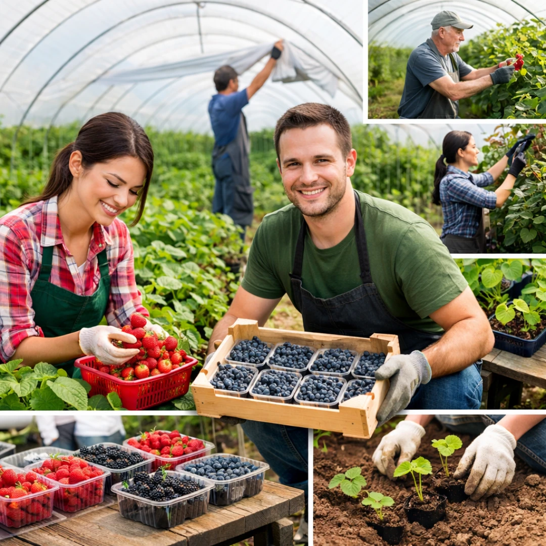 Rozmnażanie sadzonek truskawek i malin. Obejmuje to pracę w szklarniach, tunelach foliowych lub na otwartych polach, obejmującą cały cykl produkcji – od sadzenia roślin matecznych do tac z torfem w kwietniu, po zbiór „sadzonek wierzchołkowych” (tzw. tipsów) i ich przesadzanie w lipcu, przygotowując rośliny do sprzedaży.